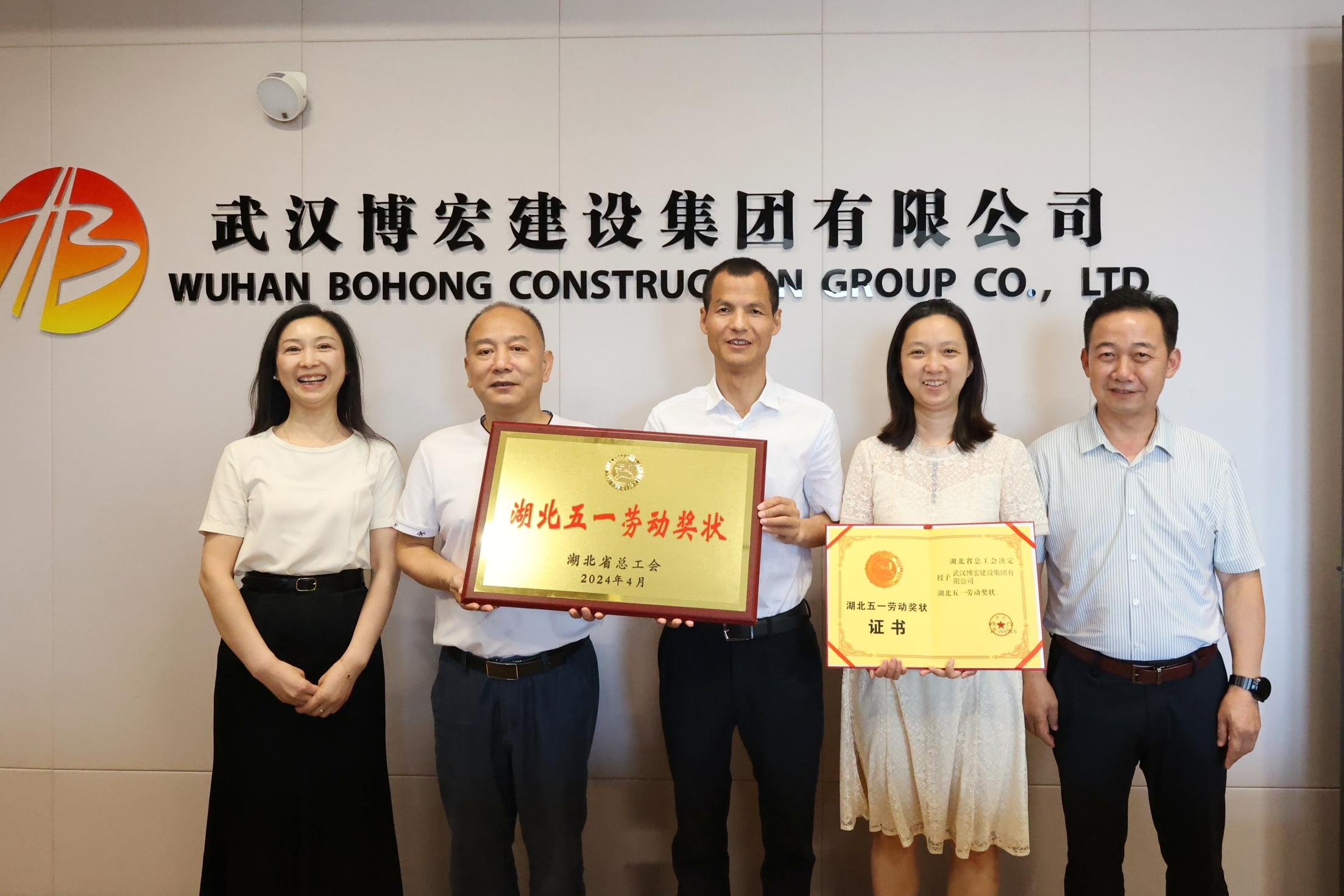 5月28日,武漢博宏建設(shè)集團(tuán)有限公司榮獲“湖北五一勞動(dòng)獎(jiǎng)狀”授牌儀式在公司30樓會(huì)議室舉行。漢陽(yáng)區(qū)總工會(huì)常務(wù)副主席李鐘為博宏建設(shè)集團(tuán)頒發(fā)“ 湖北五一勞動(dòng)獎(jiǎng)狀 ”獎(jiǎng)牌和證書(shū)。
